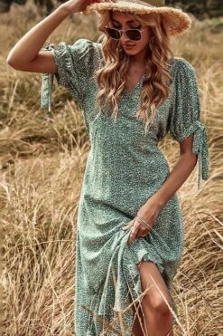Cette maxi robe verte bohème est exactement ce qu’il vous faut pour laisser briller votre esprit libre ! La coupe ample et aérée vous donnera l’impression de marcher sur un nuage, tandis que l’imprimé élégant ajoute une touche supplémentaire de sophistication. Qu’elle soit portée à un festival de musique ou lors d’un brunch entre amis, cette robe ne manquera pas de faire tourner les têtes où que vous alliez !