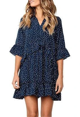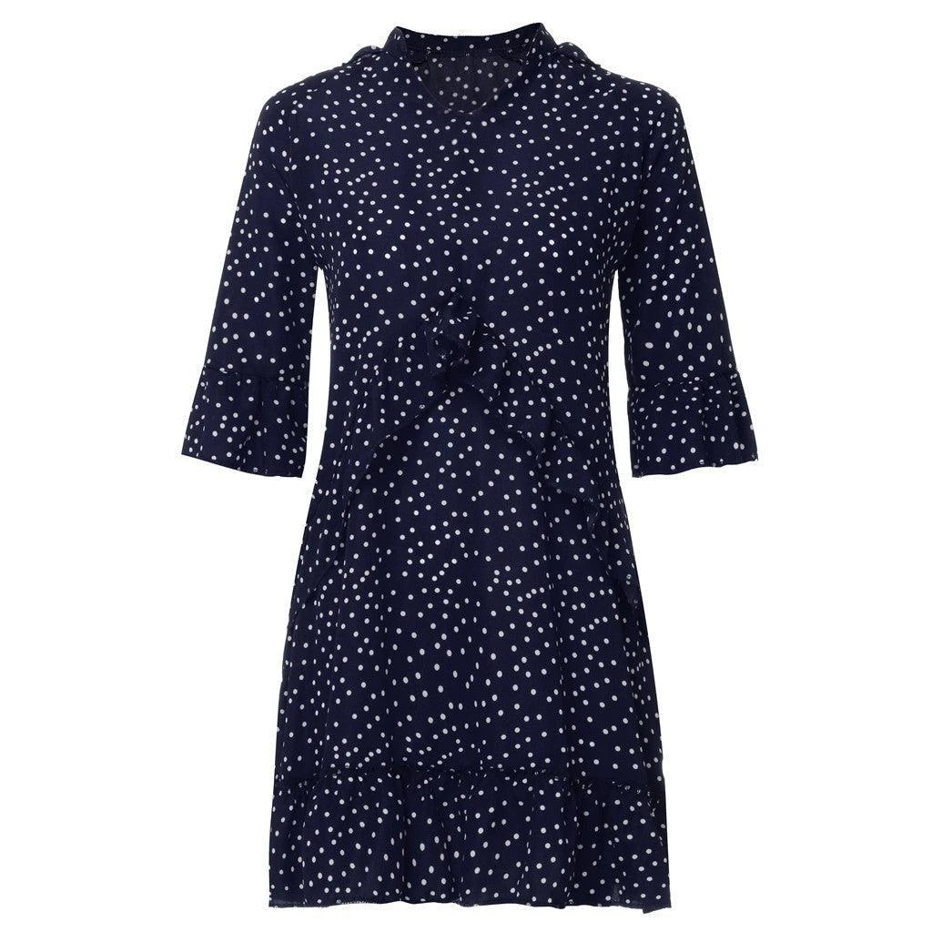 Cette robe vintage bleu marine à pois blancs est parfaite pour un look de style bohème. La coupe décontractée et le tissu confortable vous permettront de vous sentir libre de vos mouvements tout en étant élégant. Que vous voyagiez à travers le monde ou que vous sortiez pour une journée décontractée, cette robe fera certainement tourner les têtes.